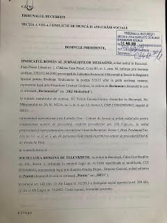 Sindicatul Român al Jurnaliştilor MediaSind, împreună cu filiala sa din Societatea Română de Televiziune, MediaSind TVR, au depus ieri, 18 martie 2019, la Tribunalul Bucureşti, cererea de chemare în judecată a conducerii TVR pentru nerespectarea prevederilor din Contractul Colectiv de Muncă.