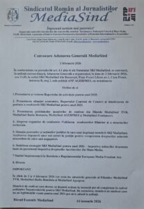 În conformitate cu prevederile art. 4.1 alin 4) ale Statutului SRJ MediaSind, se convoacă, în ședință extraordinară, Adunarea Generală a organizației, în data de 2 februarie 2026, ora 11,00, la sediul SRJ MediaSind din București, Piața Presei Libere nr.1, Casa Presei, intrarea B, etaj 2, sala ședință ANP AGERPRES, cu următoarea