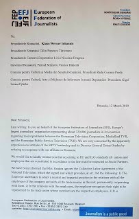 Președintele Federației Europene a Jurnaliștilor, Mogens Blicher Bjerregård, a trimis ieri, 12 martie 2019, o scrisoare Președintelui României, președinților Camerei Deputaților și Senatului, precum și președinților Comisiilor de Cultură și Media din Parlamentul României, în care cere intervenția autorităților române în conflictul declanșat în Societatea Română de Televiziune din cauza abuzurilor patronate de către președintele director general, Doina Gradea.