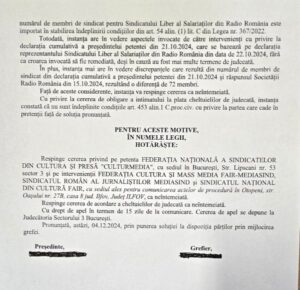 Deși instanțele de fond și de apel au admis în alte spețe argumentele susținute de Federația FAIR-MediaSind, Sindicatul Român al Jurnaliștilor MediaSind și Sindicatul Național din Cultură FAIR – privind neîndeplinirea condițiilor de reprezentativitate și suspiciuni de fals în documentele depuse de aceeași lideri ai organizației sindicale – într-un caz identic, instanța a ignorat aceste elemente esențiale. (detalii aici: Tribunalul București confirmă definitiv matrapazlâcurile sindicatului de casă pentru obținerea reprezentativității în Radio România )