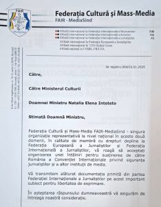 Delegația singurei organizații reprezentative în domeniile Cultură și Mass-Media – Federația FAIR-MediaSind și conducerea Ministerului Culturii s-au întâlnit astăzi, 6 martie 2025 pentru discutarea problemelor grave cu care se confruntă angajații și lucrătorii culturali independenți. Delegația Federației FAIR-MediaSind a fost condusă de președintele organizației, Leonard Octavian Pădureț, iar delegația Ministerului Culturii de către secretarul de stat Mădălin Voicu.