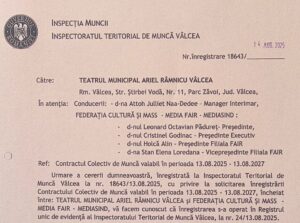 Inspectoratul Teritorial de Muncă Vâlcea a transmis Federației FAIR-MediaSind că a înregistrat Contractul Colectiv de Muncă încheiat la Teatrul Municipal ARIEL din Râmnicu Vâlcea.