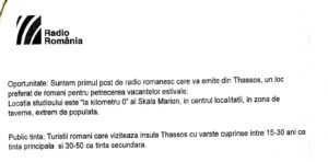 Sindicatul Român al Jurnaliștilor MediaSind – Filiala Radio România solicită public președintelui Societății Române de Radiodifuziune, Răzvan Ioan Dincă, să ofere explicații cu privire la decizia de a înființa un studio de emisie live pe Plaja Motorship (foto Taverna) din Skala Marion, Insula Thassos, Grecia, în cadrul unui proiect justificat prin livrarea de „conținut targetat, în concordanță cu obiceiurile de consum ale publicului țintă”.