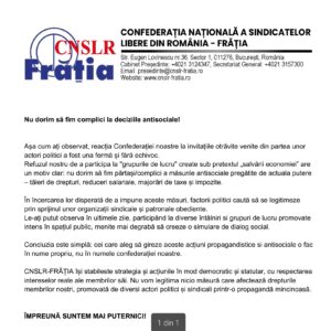 CNSLR-FRĂȚIA își stabilește strategia și acțiunile în mod democratic și statutar, cu respectarea intereselor reale ale membrilor săi. Nu vom legitima nicio măsură care afectează drepturile membrilor noștri, promovată de diverși actori politici și sindicali printr-o propagandă mincinoasă.