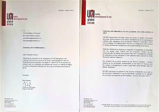 UNI MEI se alătură astfel protestelor Federației Cultură și Mass-Media FAIR-MediaSind, Sindicatului Român al Jurnaliștilor MediaSind, filialei MediaSind TVR, precum și Federației Europene a Jurnaliștilor, organizație care deja a trimis o scrisoare prin care cere autorităților române să se implice în conflictul din Societatea Română de Televiziune. (vezi aici)